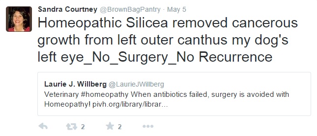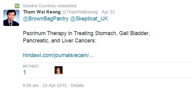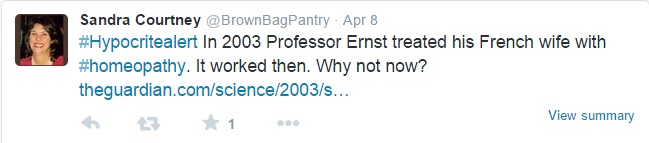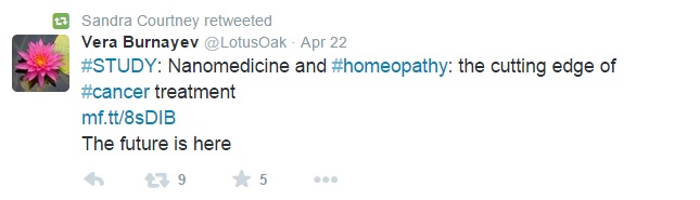 I think it works like this: in long comment threads, stuff gets quickly buried. Therefore, to catch the eye of the newly-arrived reader unlikely to spend the time negotiating all the way down it, Sandra (and the other harpies) re-fleck their guano at the top of the thread. No matter that it has been used before, wherever. No matter that it has been rejected/corrected/challenged/called out. Just re-paste – repeat-ignore… repeat-ignore… Like an unreachable, itching rash. Whilst repeatedly flagging comments she finds objectionable to the gormless moderators who permit her bastardisation of free expression as the freedom to mislead. If this is a tactic to deliberately irritate the fuck out of me and others (because she does like to get under the skin of those who find her objectionable – I imagine this is what it must be like to argue with a scientologist), then it is effective. And I suppose it would perhaps be better for my blood pressure to just turn a blind eye. But I find disturbing that she shamelessly, liberally and repetitively posts links to claimed homeopathic treatments/cures for various cancers, and gleefully endorses such claims made by others in the vicinity. And she also abuses her Twitter account for such purposes:
