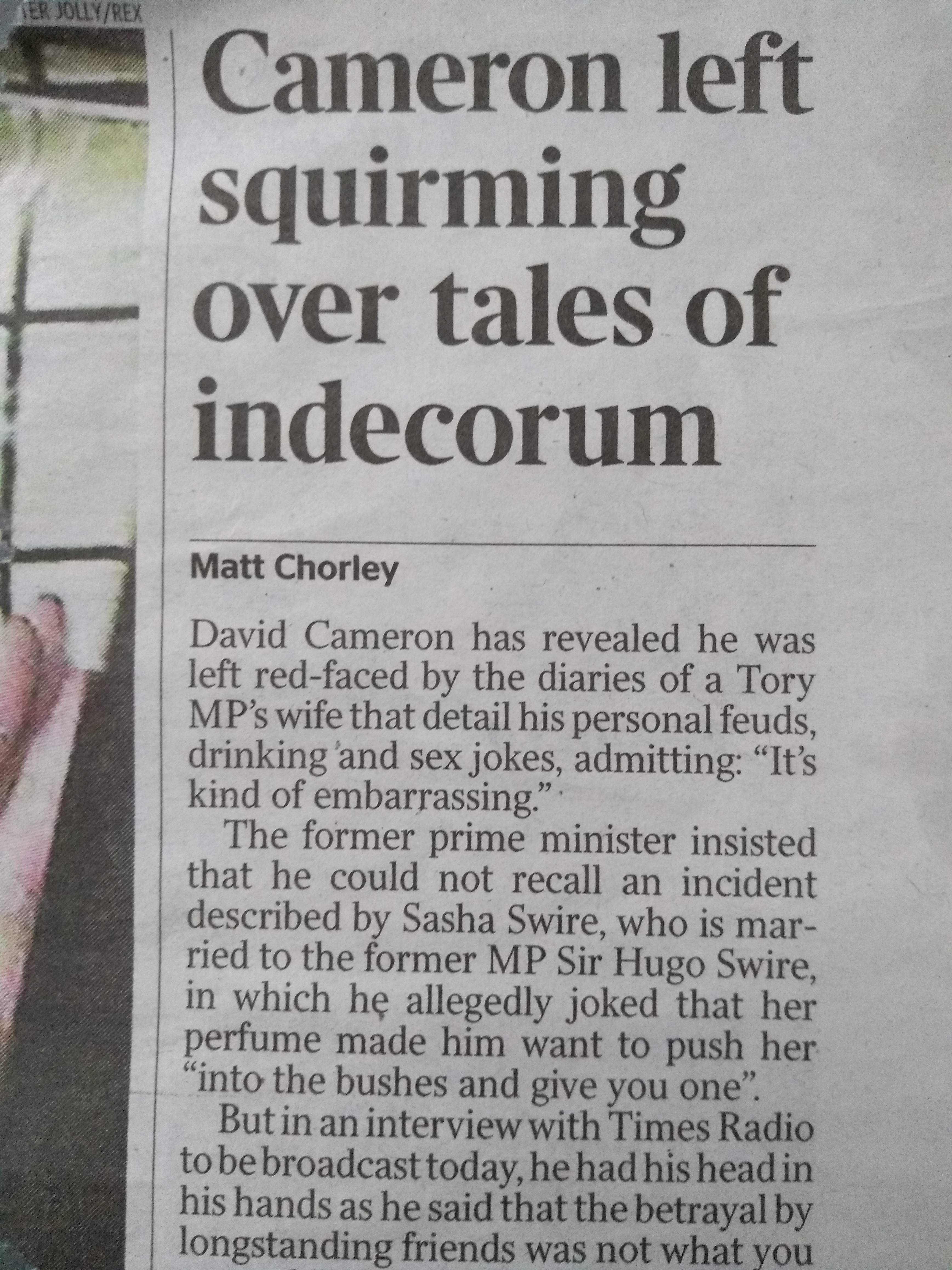 I know nothing about ‘Lady’ Sasha Swire, wife of Sir Hugo Swire, a former MP and one-time minister in Cameron’s government. “Keep a diary, and one day it will keep you”, said Mae West. Did Swire deliberately keep written records of conversations during time spent in the company of David Cameron and his family? Was this just innocent private diary keeping? Well, then, okay. Or was it a deliberate policy of amassing material for future exploitation? The titling – Diary of an MP’s Wife – suggests the latter. In which case, she’s a lousy friend! Otherwise wouldn’t her justification go something like: she never intended to publish but is doing so now in revenge for some perceived slight?
