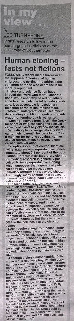 Human cloning – facts not fictions Southern Daily Echo July 23, 2005